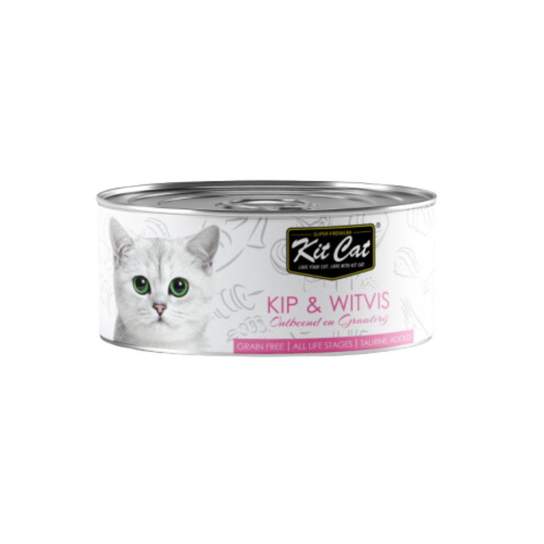 Kit Cat Kip & Witvis is zorgvuldig samengesteld natvoer geschikt voor katten van alle leeftijden. Ondersteund het gezichtsvermogen van jouw kat en verminderd het risico op nierstenen en urineweginfecties.